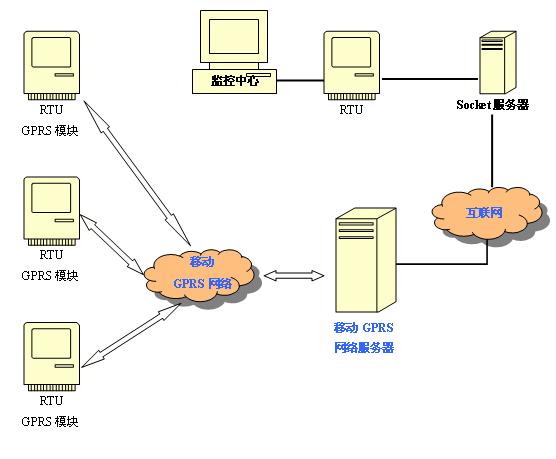 使用西安達(dá)泰電子有限責(zé)任公司的DTP_S09D模塊,該模塊可以進(jìn)行透明數(shù)據(jù)傳輸,這樣可以不用更改RTU自身的數(shù)據(jù)協(xié)議,只需要將遠(yuǎn)程接收服務(wù)器(簡(jiǎn)稱:Socket服務(wù)器)網(wǎng)絡(luò)工作參數(shù)保存到DTP_S09D模塊中(達(dá)泰電子已提供設(shè)置軟件),模塊上電后自動(dòng)與上位機(jī)進(jìn)行網(wǎng)絡(luò)連接,對(duì)于RTU自身來說,依然是原有的串口傳輸方式,而將網(wǎng)絡(luò)傳輸部分交給DTP_S09D來完成的,DTP_S09D通過GPRS網(wǎng)絡(luò)將數(shù)據(jù)發(fā)送給移動(dòng)GPRS服務(wù)器,再經(jīng)移動(dòng)GPRS服務(wù)器通過Internet發(fā)送給Socket服務(wù)器。