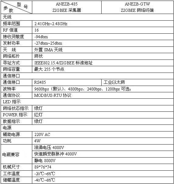 表2 ANEZB系列ZIGBEE通訊模塊性能參數表