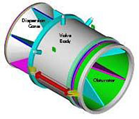 該閥在整個工作范圍內不會產生氣蝕及振動,在小流量時仍具有良好的流量控制效果。其結構為一個固定的倒置錐形,先進的水力設計形體及用來降低振動的4個導流翼葉片支撐,流量則由外部活動套管的前后移動來控制,閥體上分別設有金屬對金屬的閥座和或補充性的軟密封閥座,或兩者構成了復合式的閥座確保密封性能。在排放到大氣中時,水流以寬廣的錐形角度擴散,并分解為稀薄噴淋形態,將能量消耗在空氣之中。通常根據實際需求,可以要求控制水流區域,則在出口安裝一個不同形式的導流罩,這不僅能將空氣與充分水混合,而且還集中流量。