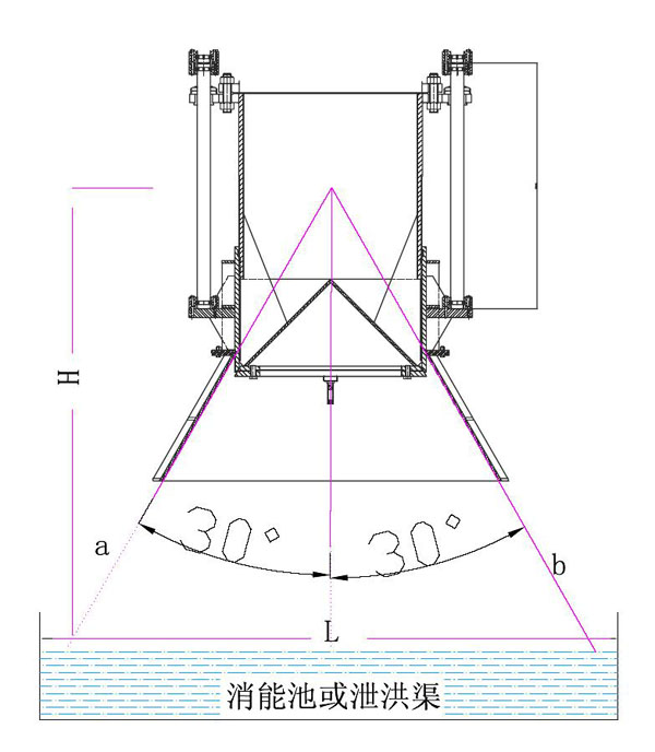 (2) 限制發散型:利用導流罩有效控制錐形閥的出口發散程度:都用于水頭高,出口狹小,涉及建筑物或其他設施等;如圖所示,用戶應根據設計消能池或泄洪渠的具體尺寸選擇合適的導流罩,具體如圖所示,a、b為導流罩的夾角延長線,L為消能池或泄洪渠的寬度,H為導流罩夾角頂部到消能池或泄洪渠表面的高度,按等邊三角形原理計算該選用的導流罩角度。