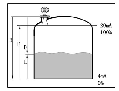 智能型雷達物位計輸入 天線接收反射的微波脈沖并將其傳輸給電子線路,微處理器對此信號進行處理,識別出微脈沖在物料表面所產生的回波。正確的回波信號識別由智能軟件完成,精度可達到毫米級。距離物料表面的距離D與脈沖的時間行程T成正比: D=C×T/2 其中C為光速 因空罐的距離E已知,則物位L為:L=E-D 智能型雷達物位計輸出 通過輸入空罐高度E(=零點),滿罐高度F(=滿量程)及一些應用參數來設定,應用參數將自動使儀表適應測量環境。對應于4-20mA輸出。