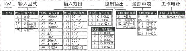 ⊙型號(hào)構(gòu)成,可以看出測(cè)量(交直流電流,交直流電壓,倒數(shù)運(yùn)算,二線電阻,電位計(jì)信號(hào))