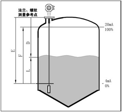 通過(guò)輸入空罐高度E(=零點(diǎn)),滿罐高度F(=滿量程)及一些應(yīng)用參數(shù)來(lái)設(shè)定,應(yīng)用參數(shù)將自動(dòng)使儀表適應(yīng)測(cè)量環(huán)境。對(duì)應(yīng)于4-20mA輸出。