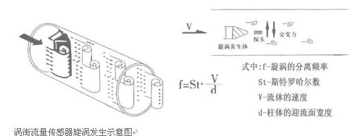 一定雷諾數(shù)范圍內(nèi)(2×104~7×106 ),旋渦的釋放頻率f與流體流速V及旋渦發(fā)生體的迎流面寬度d之間關(guān)系式為f=St?v/d,式中St 為斯特勞哈數(shù),它是一個無量綱的系數(shù),只要準(zhǔn)確測出頻率f,就可以求得流體流速v,由v求出體積流量。