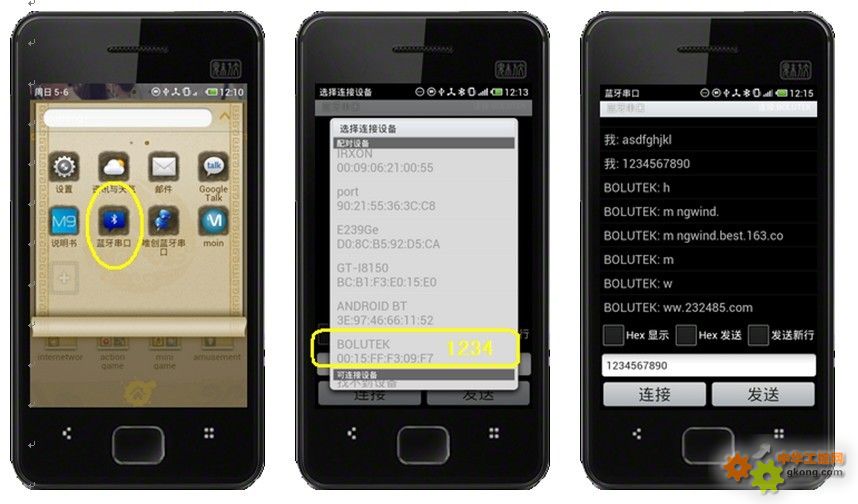 BLU232可以為帶藍牙的智能手機擴展出一個無線串口。1、將BLU232接上電源,燈閃爍。 2、藍牙——“添加藍牙設(shè)備”,無線掃描找到藍牙BOLUTEK,輸入配對密碼:1234,燈閃爍。 3、BLU232默認為從機狀態(tài)、波特率等格式為(9600,n,8,1)。 在ANDROID下可以使用“藍牙串口.apk”等軟件進行智能手機的串口通信,此時燈連續(xù)亮。