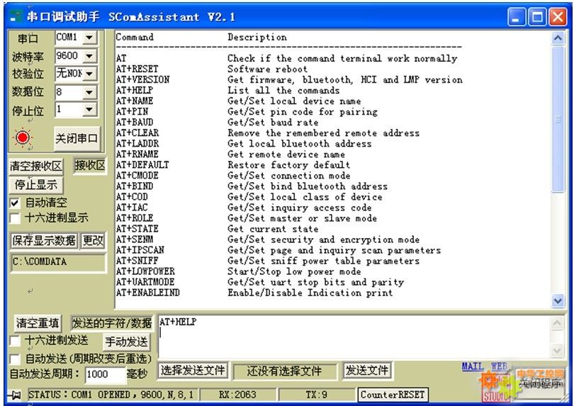 在“串口調(diào)試助手”的發(fā)送欄填寫 AT+HELP 再敲回車換行,此時光標停留在第2行,按“手動發(fā)送”,就會在接收欄顯示各種AT指令。