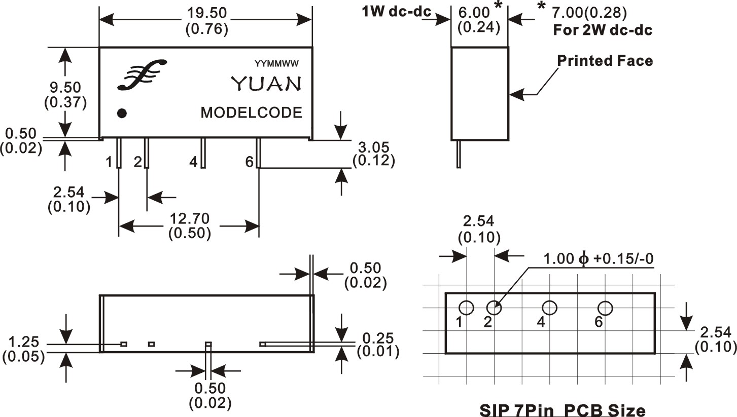 體積特性 SIP 封裝尺寸 1W:19.60 x 6,00 x 10,00 mm 0,77 x 0,23 x 0,39英寸 2W:19.60 x 7,00 x 10,00 mm 0,77 x 0,28 x 0,39英寸 DIP 封裝尺寸 1W/2W: 20.40 x 8.20 x 10,00 mm 0,80 x 0,27 x 0,32英寸