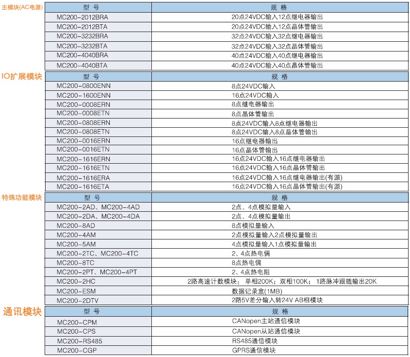 MC200系列是一款小型高性能PLC,具有強大擴展功能和通信組網功能,能進行高速數據處理、模擬量處理,具有高速計數和高速脈沖輸出定位控制功能。已廣泛應用于大型機床設備、紡織印染、工程機械、拉絲設備、塑料機械、電子設備、電梯、空調、地鐵等行業。