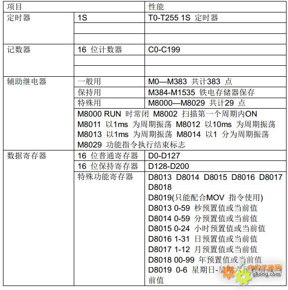 內(nèi)部繼電器總計(jì)有1536 點(diǎn),帶有特殊功能繼電器和保持用繼電器。定時(shí)器256 點(diǎn)。計(jì)數(shù)器200 點(diǎn)。數(shù)據(jù)寄存器256 點(diǎn)。