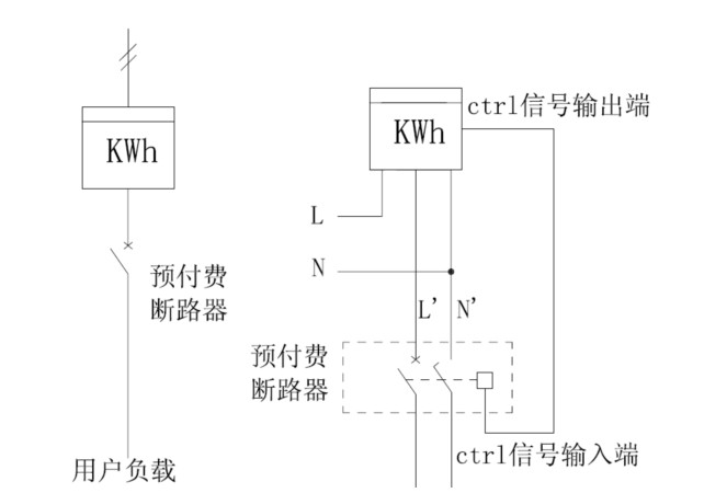 注:①接線時務(wù)必擰緊,避免因接觸不良而引起電能表工作不正常;②電能表ctrl端子用于連接預(yù)付費表專用斷路器的ctrl信號輸入端,以完成對負(fù)載回路的控制。控制示意圖如下: