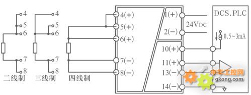 2.三線制電阻信號輸入時,隔離柵端子5.6,