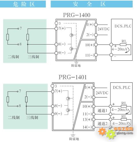 2/3線制本質安全熱電阻隔離式安全柵將現場2/3線制熱電阻的信號轉換成標準的4mA~20mADC電流信號隔離傳輸到安全側。