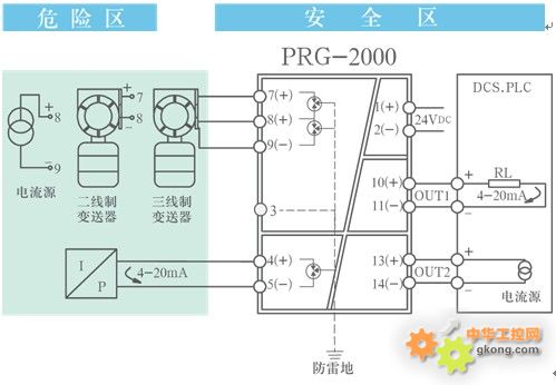 PRG-2000檢測端/操作端隔離式安全柵,通道一從安全側(cè)把標(biāo)準(zhǔn)4mA~20mA電流信號(hào)傳輸?shù)轿kU(xiǎn)側(cè),驅(qū)動(dòng)現(xiàn)場的執(zhí)行機(jī)構(gòu)工作。通道二從安全區(qū)向危險(xiǎn)區(qū)提供24V隔離直流電源供給二線制變送器,變送器產(chǎn)生4mA~20mA電流信號(hào)從危險(xiǎn)區(qū)隔離傳輸?shù)桨踩珎?cè)輸出(或轉(zhuǎn)換為1V~5VDC輸出)。該產(chǎn)品需獨(dú)立供電(電源、輸入、輸出間全隔離)。