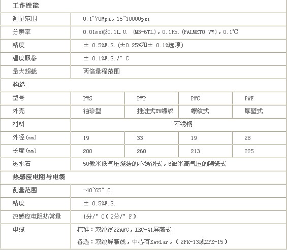 PWS型可以埋設在填土中以及混凝土的交界處,也可嵌入鉆孔或小直徑的管中,它由內裝有壓力傳感器和熱感應電阻的小直徑圓形保護管組成。保護管的一端放置有高氣壓或低氣壓透水石的嵌口,另一端則引入密封的電纜線。透水石在保護管的前端用O形密封圈密封,經過透水石后,柔性膜就和固體顆粒隔離開而只承受要測量的液體壓力。透水石很容易取下進行清洗與校正。