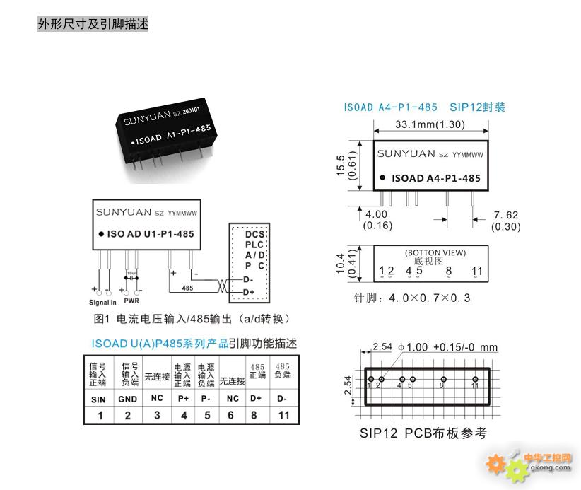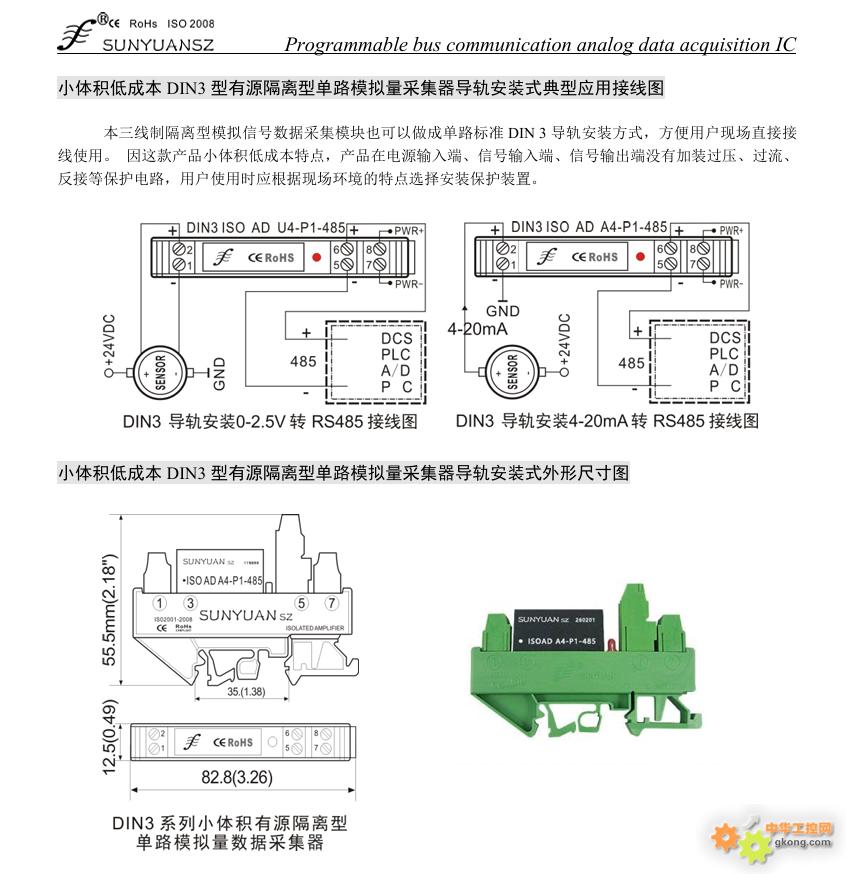 本次研制的SunYuan ISO AD U(A)-P-485低成本、小體積三線制有源帶通訊智能隔離數據采集模塊采用有源設計,可將0~5V/0~10V/1~5V/0~±100mV/0~20mA/4~20mA等模擬信號進行AD轉換,并按設定量程范圍線性遷移后送到上位機采集讀取。該IC具有反向和過流保護,適用于各種類型的傳統變送器及儀器儀表數字智能化控制裝置升級改造及石油化工、環境監測、采礦行業對溫度、壓力、流量、液位等物理量控制點的智能化監測。在大多數工業現場是采用各種類型的傳感器將溫度、壓力、流量、轉速等物理量轉化為模擬電信號,再通過這種數據采集IC進行隔離放大及AD模數轉換以后送到變送器、控制儀表、PLC/DCS、上位機設備等進行遠程測量控制。
