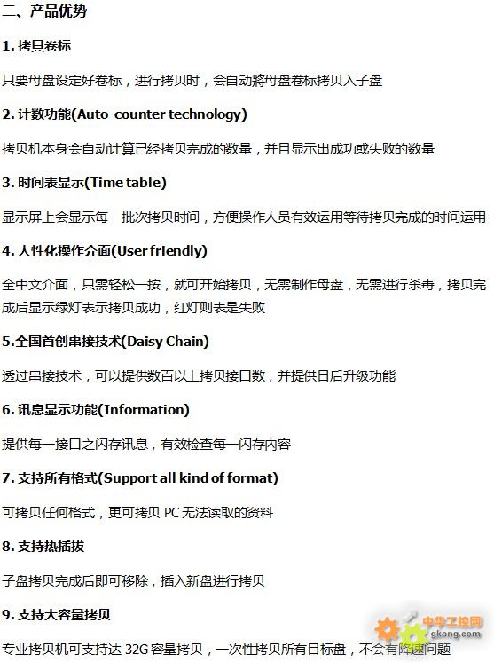 根據市場需求,我司提供全系拷貝機:硬盤拷貝機、光盤拷貝機、DOM拷貝機、CF卡拷貝機、SD卡拷貝機、T卡拷貝機、M2卡拷貝機、U盤拷貝機、加密拷貝機、便攜拷貝機、DVD拷貝機等,主要應用在U盤、硬盤、PSP、點讀筆、學習機、兒童玩具、內置存儲芯片產品、工控系統、媒體廣告行業的生產制造的質量檢測、批量生產的數據拷貝、大量的數據比對等方面