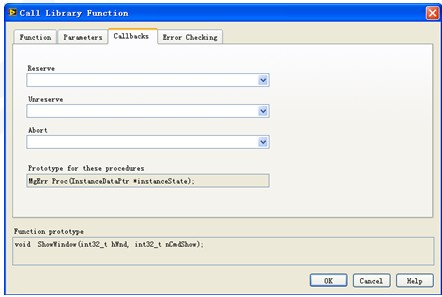 如果為Reserve選擇了一個回調函數,那么當一個新的線程開始調用這個DLL時,這個回調函數首先被調用。可以利用這個函數為新線程使用到的數據做初始化工作。線程在使用完這個DLL之后,它會去調用Unreserve中指定的回調函數。Abort中指定的函數用于VI非正常結束時被調用,也就是讓一個程序在運行完前停止。這些回調函數的原型在Prototype for these procedures中列出,必須要由DLL的開發者按照特定的格式實現。如果使用的DLL不是專為LabVIEW設計的,一般不會包含這樣的回調函數。
