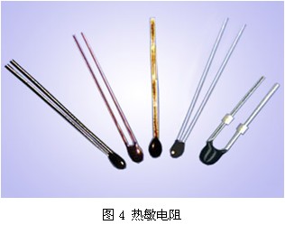 熱敏電阻是對溫度敏感的半導體(圖4),與RTD相似,其阻抗隨溫度變化而變化。熱敏電阻由玻璃或環氧珠封裝的金屬氧化物半導體材料制造而成。而且,熱敏電阻的典型標稱阻抗值要比RTD高得多,阻抗值從2000Ω到10,000Ω,故可用于較低電流的測量。熱敏電阻具有較高的靈敏度(約200 Ω/°C),這使得它對于溫度的變化非常靈敏,具有極高的響應速率,但它的使用范圍最高為300至500 °C。同樣,熱敏電阻也需要激勵,接線方式也有二三四線制之分,但是由于熱敏電阻的標稱阻抗非常高,所以連線阻抗不會影響其測量值的精度,因此,二線制測量精度對于熱敏電阻已經足夠,所以這種接線方式在熱敏電阻中最為常用。