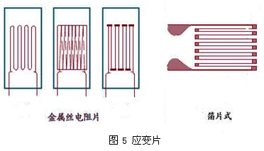金屬應變片由極細的金屬絲或薄片組成,繞成柵狀的形式使它們可以在平行的方向上最大程度地跟隨應變發生變化(圖5)。柵格粘在被稱為載體的薄襯底上,并直接與被測試件連接。因此,被測件產生的應變直接反映到應變片上,使得應變片電阻值產生線性變化。應變片的阻值在30Ω到3000Ω,最常見的阻值標準是120Ω和350Ω。