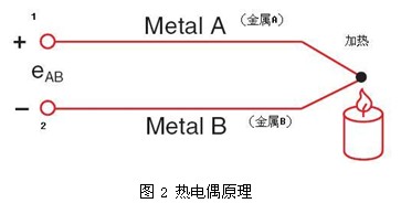 熱電偶測溫的基本原理是兩種不同材質導體組成閉合回路,當兩端存在不同溫度時,回路中就會有電流通過,此時兩端之間就存在熱電勢,這就是所謂的塞貝克效應。熱電偶直接用作測量介質溫度的一端叫做工作端(也稱為測量端),另一端叫做冷端(也稱為補償端);冷端與儀表連接,顯示熱電偶所產生的熱電勢(圖2)。