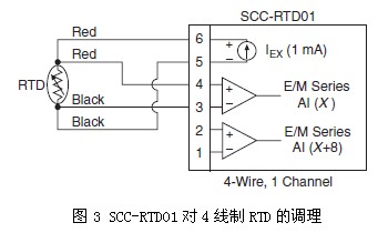 NI SCC-RTD01是針對熱電偶調理的雙通道模塊,可連接2、3或4線鉑電阻RTD(圖3)。NI SCC-RTD01的每一通道都帶有一個增益為25的放大器和一個30Hz低通濾波器,每一模塊上還提供用于1或2個RTD的1mA激勵源。NI SCXI-1102模塊與NI SCXI-1581電流激勵模塊一起使用,可以提供32通道的高精度RTD或熱敏電阻調理。1102帶有一個2 Hz低通濾波器,1581則提供穩定的100µA電流源,從而確保測量精度。由于SCXI采用模塊化設計,在應用需求改變時可以方便地擴展數據采集系統。