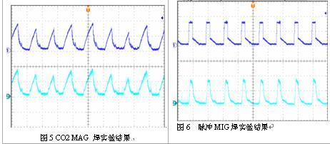 采用上述傳感器做對輸出電流進行采樣,編制相應的閉環控制軟件,不同的焊接工藝對于輸出電流的變換規律是不一樣的,短路過渡中,電弧負載為短路和燃弧狀態的周期性切換。在短路狀態,輸出電流要按照一定的斜率向上升,斜率太大,引起焊絲的硬爆斷,斜率太小,短路時間變長,會發生頂絲現象。在然弧段,希望燃弧初期,電流快速下降,而燃弧后期,電流要維持一個平臺,以保證足夠的熔深。而脈沖MIG焊,可以在很小的電流范圍內實現射滴過渡,在脈沖峰值期間,熔滴噴射出去,而在脈沖基值期間,維持電弧狀態并加熱熔池。輸出電流需要周期性地快速變化,并且變化的幅值很大。例如采用1.2mm炭鋼焊絲120A焊接時,基值電流約為35A,而峰值電流約為420A。可見,無論是CO2MAG焊,還是脈沖MIG焊,輸出電要都要周期性地快速變化。圖5為120A/18.5V CO2 MAG焊接時,給定地電流波形和反饋電流波形。而圖6為120A/20V 脈沖MIG焊時電流的給定和輸出電流地信號,可見整個電流環具有快速的跟蹤性能,并且基本上可以做到任意波形的無差跟蹤。
