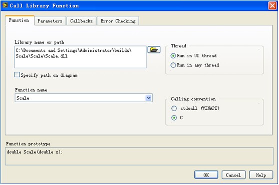 在程序框圖放入Call Library Function Node,雙擊彈出對話框。在Function頁面的Library name or path中給入生成的Scale.dll文件的路徑,Function name選擇Scale,其他選項默認(rèn)。