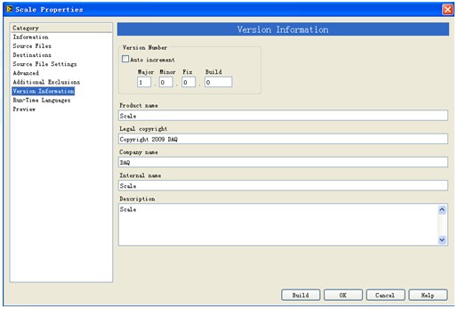 Category中的Source Files可供用戶對打包VI的屬性和密碼做一些設(shè)置;Advanced和Additional Exclusions可以做一些高級的設(shè)置,這些均按默認(rèn)值即可。Version Information可讓用戶填寫版本號、名稱、版權(quán)、公司等信息: