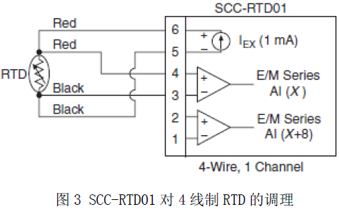 熱電阻(RTD) 熱電阻是中低溫采集時常用的一種溫度傳感器,它的主要特點是測量精度高,性能穩定,靈敏度高。熱電阻是基于金屬導體或半導體的電阻值隨溫度的增加而增加這一特性來進行溫度測量的,其大都由純金屬材料制成,目前使用最多的是鉑。熱電阻需要電源激勵,且不能夠瞬時測量溫度的變化。工業用熱電阻一般采用Pt100,Pt1000,Cu50,Cu100等多種型號。 熱電阻的引線對測量結果會有較大的影響,目前熱電阻的引線主要有三種方式:二線制,三線制,四線制。二線制是在熱電阻的兩端各連一根導線來引出電阻信號,這種引線方法很簡單,但是測量精度不高。在熱電阻一端連接一根引線,另一端連接兩根引線的方式稱為三線制,這種方式通常與電橋配套使用。因為熱電阻作為電橋上一個橋臂的電阻,其連接導線也是橋臂的一部分,而這部分電阻是未知且隨環境溫度變化的,會造成測量誤差。采用三線制,將導線一根接到電橋的電源端,其余兩根分別接到熱電阻所在的橋臂及相鄰橋臂上,這樣較好地消除了導線電阻帶來的測量誤差。熱電阻兩端各連接兩根導線的方式稱為四線制,其中兩根為熱電阻提供激勵電流,把電阻轉換成電壓信號,再通過另兩根輸出電壓供采集,這種引線方式可完全消除引線電阻的影響,主要用于高精度的溫度檢測,但成本也最高。 NI SCC-RTD01是針對熱電偶調理的雙通道模塊,可連接2、3或4線鉑電阻RTD(圖3)。NI SCC-RTD01的每一通道都帶有一個增益為25的放大器和一個30Hz低通濾波器,每一模塊上還提供用于1或2個RTD的1mA激勵源。NI SCXI-1102模塊與NI SCXI-1581電流激勵模塊一起使用,可以提供32通道的高精度RTD或熱敏電阻調理。1102帶有一個2 Hz低通濾波器,1581則提供穩定的100μA電流源,從而確保測量精度。由于SCXI采用模塊化設計,在應用需求改變時可以方便地擴展數據采集系統。