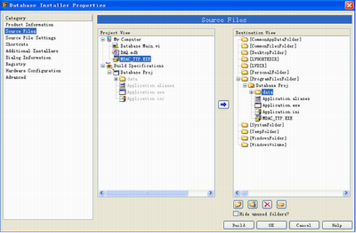 生成安裝文件時則需要添加微軟數據庫的訪問組件MDAC(Microsoft Data Access Components)文件。這個命名為mdac_typ.exe的可執行文件位亍LabVIEW安裝路徑中Database文件夾下的MDAC文件夾中,如果沒有也可以在微軟的官方網站上下載。將其添加到項目管理器中之后,開始創建安裝文件,我們需要在Source Files中將剛剛生成的可執行文件添加到ProgramFileFolder文件夾中,接著添加mdac_typ.exe文件(圖8)。