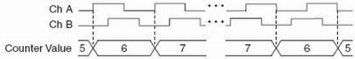 X2編碼方式時,計數(shù)器A通道的每個邊沿計數(shù)是增加還是減少,取決于由哪個通道引導(dǎo)哪個通道。計數(shù)器的數(shù)值每個周期都會增加2個或減少2個(圖10):