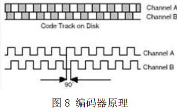 按照工作原理編碼器可分為增量式和絕對式兩類。增量式編碼器是將位移轉(zhuǎn)換成周期性的電信號,再把這個電信號轉(zhuǎn)變成計數(shù)脈沖,用脈沖的個數(shù)表示位移的大小。而絕對式編碼器的每一個位置對應(yīng)一個確定的數(shù)字碼,因此它的值只與測量的起始和終止位置有關(guān),而與測量的中間過程無關(guān)。 在增量式中編碼器獲得物體的相對位置。旋轉(zhuǎn)編碼器可以測量物體運動的角位移,它由一個發(fā)光二極管(LED)、一個碼盤,以及碼盤背面的一個光傳感器。這個碼盤安置在旋轉(zhuǎn)軸上,上面按一定編碼形式排列著不透光和透光的扇形區(qū)域。當(dāng)碼盤轉(zhuǎn)動時,不透光扇區(qū)能夠遮擋光線,而透光扇區(qū)則允許光線透過。這樣就產(chǎn)生了方波脈沖,可以編譯成相應(yīng)的位置或運動信息。編碼器每轉(zhuǎn)通常分為100到6000個扇區(qū),100個扇區(qū)的編碼器可以提供3.6度的精度,而6000個扇區(qū)的編碼器則可以提供0.06度的精度。 僅有一路脈沖輸出的編碼器不能確定旋轉(zhuǎn)的角度,如果使用兩路脈沖,其間的相位差為90度,那么通過該正交編碼器的兩路輸出通道就可以確定位置和旋轉(zhuǎn)的方向兩個信息。例如,如果通道A相位超前,碼盤就以順時針旋轉(zhuǎn)。如果通道B相位超前,那么碼盤就是以逆時針旋轉(zhuǎn)(圖8)。因此,通過監(jiān)控脈沖的數(shù)目和信號A、B之間的相對相位信息,就可以同時獲得旋轉(zhuǎn)的位置和方向信息。除此之外,有些正交編碼器還包含被稱為零信號或者參考信號的第三個輸出通道Z相。這個通道每旋轉(zhuǎn)一圈輸出一個單脈沖,可以通過它來精確計算某個參考位置,這種編碼器被稱為三相編碼器。