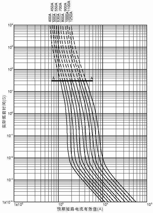 弧前時間具體值可從圖五查得。可以查到額定電流800A的快速熔斷器,當短路電流為13222A時,弧前時間<2mS;當短路電流為99165A時,弧前時間< 0.1mS。第二段為弧斷時間,這是產生電弧和滅弧所需的時間,在此期間電流是不斷減小的。