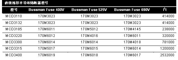 丹佛斯說明書中要求MCD3220前級安裝BUSSMANN的170M6012半導體熔斷器,要求的可控硅需要的短路保護I2 t值為320000A2 S,也就是MCD3220軟起動器使用的可控硅T588N16TOF需要的短路保護I2 t值。