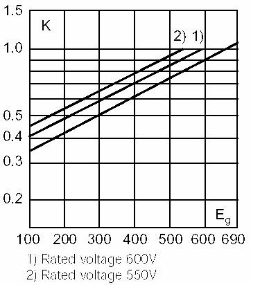 由于BUSSMANN的手冊中給出的弧斷I2 t值為660V電網電壓時的數據,所以還要查表求出400V電網電壓時的修正系數,從右圖可以查到修正系數約為0.61。則可得: