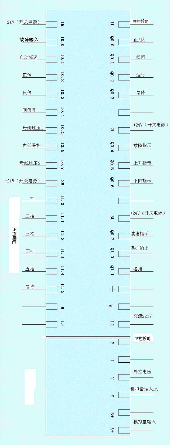 輸出:去主板的信號(1):公共點、正/反、松閘、運行、急停、外控電壓輸入。