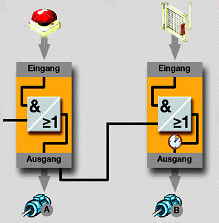 邏輯控制功能 幾個 PNOZelog 可以通過 “ 與 / 或 ” 邏輯功能而連接 ( 普通繼電器是沒有此類功能的 ), 這樣可以取代繼電器外圍的硬接線。 一臺設備中所有的 PNOZelog 可以被連接在一起來實現一個完整的安全功能。 |