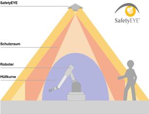 整個系統由三部分組成:傳感器單元、一臺高性能計算機和一個可編程的安全控制系統。傳感裝置由三個高精度的動態照相機組成,產生監測空間的圖像數據。高性能的計算機作為分析單元,通過光纜接收來自照相機的圖像數據并使用安全的算法產生空間圖像,這樣才可能從三維對目標進行觀測并且精確定義它們的位置。將此信息輸入到系統中配置的檢測區域用以確定是否有目標進入危險區域。例如,高性能的計算機將圖像處理結果傳輸到PSS可編程安全控制器,PSS控制器的輸入和輸出直接與機器自身的控制器連接,并負責整個SafetyEYE系統的運行。如果分析單元給出的信號說明有目標進入危險區域,那么配置系統的輸出就將被切斷,與其連接的外圍設備也可以通過SafetyBUS p的安全總線系統切斷,將來還有可能通過SafetyNET p 以太網來實現。檢測區域、警告區域以及其他一些操作安全照相系統所需的參數都可以通過配置好的PC機和專業的軟件包來進行設定。