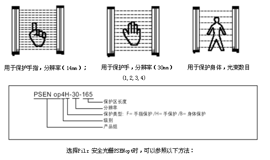 針對PSENopt的以上特點以及應用范圍,Pilz設計了根據不同保護特性以及防護等級的安全光柵和光幕。防護等級設計為等級2和等級4;可以保護手指、手以及身體。保護區長度從150mm到1650mm 不等。