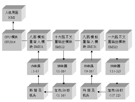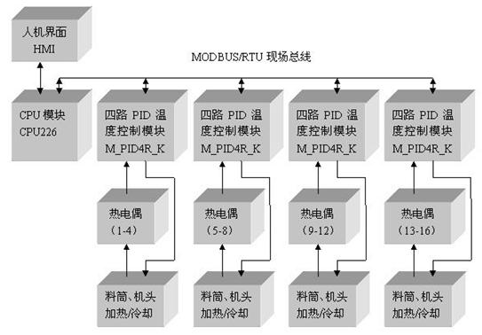 以多回路PID溫度控制智能模塊為核心,匹配低級別PLC構建塑料擠出機溫度控制系統(tǒng)是一個多溫區(qū)控制的理想方案。系統(tǒng)硬件配置圖如圖2所示: