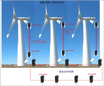 風(fēng)機(jī)塔基內(nèi)的環(huán)網(wǎng)交換機(jī)OMATE6300(提供6個(gè)10/100M電口,2個(gè)100M光口),通過(guò)光纖與其它風(fēng)機(jī)內(nèi)的交換機(jī)OMATE6300構(gòu)建百兆冗余網(wǎng)絡(luò),保障網(wǎng)絡(luò)快速自愈,提高數(shù)據(jù)傳輸?shù)陌踩、可靠性、抗干擾能力。