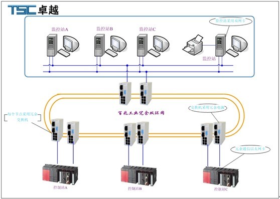控制系統(tǒng)的基本冗余要求就是通信網(wǎng)絡(luò)每一部分在出現(xiàn)電源故障后都能夠連接到后備電源上,一旦停電,后備電源就開始接替供電,并且通過E—mail或者繼電器輸出向管理人員發(fā)送電源故障警報。介質(zhì)冗余可以在部分網(wǎng)絡(luò)網(wǎng)絡(luò)節(jié)點處構(gòu)成一條備用路徑,這就是TSC所倡導(dǎo)的工業(yè)以太網(wǎng)環(huán)網(wǎng)技術(shù)。