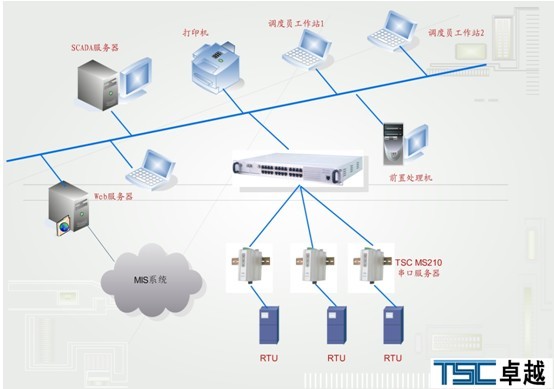 本案例中,縣級電力調度監控系統和變電站集中控制中心(集控站)中大量采用了TSC公司的串口設備聯網服務器MS210系列產品,作為RTU(遠方數據采集單元)或其它數據采集設備通過串口通信接入SCADA局域網的解決方案。具有良好的性能價格比。