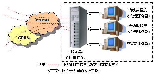 數(shù)據(jù)處理中心工作站是整個(gè)網(wǎng)絡(luò)系統(tǒng)的主控部分,由一臺(tái)主服務(wù)器和三臺(tái)數(shù)據(jù)處理服務(wù)器組成。主服務(wù)器在公網(wǎng)上有固定的IP地址,三臺(tái)數(shù)據(jù)服務(wù)器通過(guò)集線器與主服務(wù)器聯(lián)網(wǎng)。主服務(wù)器上安裝有SQL SERVER,用于接收和處理雨量資料,三臺(tái)數(shù)據(jù)處理器分別負(fù)責(zé)接收來(lái)自GPRS無(wú)線傳輸?shù)挠炅空拘畔ⅰ⒔邮諄?lái)自有線傳輸?shù)挠炅空拘畔⒑蛯?duì)政府部門提供雨量數(shù)據(jù)服務(wù)(如網(wǎng)頁(yè)瀏覽、信息服務(wù)等)。從各測(cè)站發(fā)回的氣象資料經(jīng)整理后存入SQL Server數(shù)據(jù)庫(kù),并通過(guò)網(wǎng)頁(yè)瀏覽方式提供給政府決策部門及其他用戶。