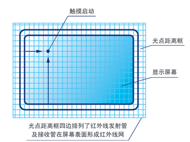 易優特(EDU-Touch)紅外觸摸屏的工作原理,是在觸摸屏的四周布滿紅外接收管和紅外發射管,這些紅外元件在觸摸屏的表面排列呈一一對應的位置關系,形成一張由紅外線布成的紅外線柵格,當有物體(可以是手指、或者其它類似物體)進入柵格后,進入點處橫豎兩個方向的紅外接收管所接收到的紅外線的強弱就會發生變化。通過對這種變化的檢測,觸摸屏的就能夠確定是否發生了觸摸事件,以及何處發生了觸摸事件。