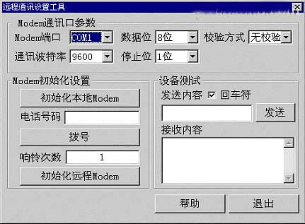 遠程監控主要用于生產廠家或產品服務商對現場使用設備進行在線、遠程的監視和控制。遠程監控主要使用在遠程通訊設備帶有通訊功能,在遠程有計算機的情況。本地計算機可以通過遠程計算機對通訊設備進行控制操作。 硬件設備: 兩臺工控機、兩個MODEM和一個交換機(或兩個可以撥號的電話線)、一個RS232/485轉換器,1臺通訊設備(以天辰PID控制儀為例)。 硬件初始化: 在使用MCGS的遠程監控方案時,必須對Modem的參數進行新設置(也叫Modem初始化),否則遠程監控不會成功。Modem初始化的具體操作如下: 選擇MCGS組態軟件“工具”菜單下的“Modem設置工具”,進入Modem設置窗口,如下圖所示: