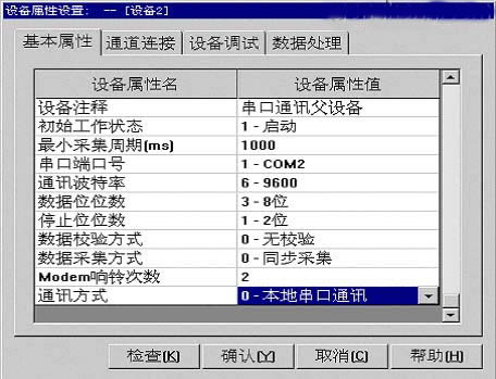 在進行“低速網絡:Modem”的屬性設置時,除了正確設置波特率等參數外,電話號碼一項要留空。在進行”網絡數據同步“屬性設置時,注意正確填寫遠端設備的名稱。 ● “串口通訊父設備”基本屬性設置如下圖所示。