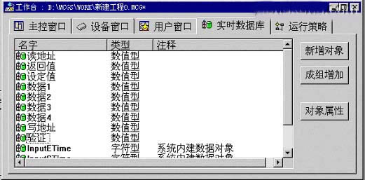 ● 創建一個新用戶窗口,命名為“遠程診斷”。在實時數據庫中填加一些變量。如下圖所示。