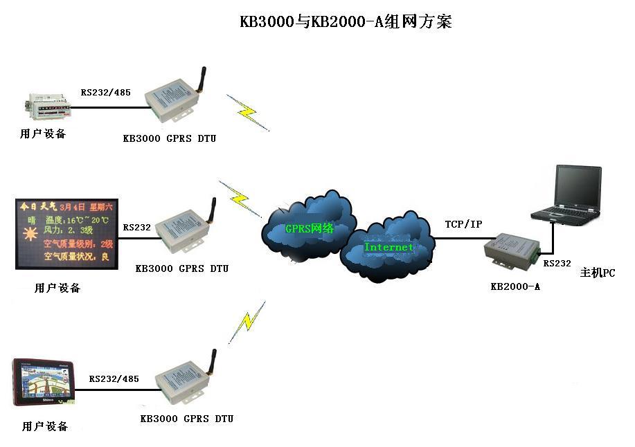 KB2000與KB3000組網:GPRS組網應用即插即用,用戶無需做軟件開發與修改,主站電腦、終端串口設備只需接上KB2000網絡轉換器與KB3000 GPRS DTU即可。 KB3000 GPRS DTU l 全透明數據傳輸與多種協議傳輸可選 l 支持虛擬專網VPN l 支持固定IP與動態域名 l 可與KB2000網絡轉換器組網,即插即用,無需軟件開發 l 可與KB3000自身組網,支持一對一,一對多 l 免費提供固定IP測試與試用 l 可提供服務器軟件,用戶的采集軟件可以在任何客戶機上運行 l 性能穩定可靠,可連續傳輸大量的數據從不丟包 l ARM軟件功能強,緩存大128K l 工業產品,抗干擾能力強,可在電磁惡劣環境應用,適應高溫低溫工作環境 KB2000網絡轉換器(互聯網) l KB2000-A與KB2000-B組網,實現串口的互聯網全透明傳輸 l 傳輸距離遠,不受地域限制(只需兩端能上互聯網) l 即插即用,無需軟件開發 l 支持一對一,一對多通訊,用戶可選 l KB2000-A與KB3000組網,即插即用,無需軟件開發 l IO功能:兩路開關量輸入,兩路開關量輸出 l 互聯網遠程數據通訊方案新穎,成本低廉,無需流量費用 l 技術與專業 打造高品質