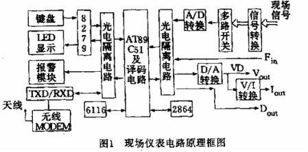 現(xiàn)場(chǎng)儀表開(kāi)發(fā)擬采用基于AT 89C51 的單片機(jī)開(kāi)發(fā)系統(tǒng)作為核心, 主要監(jiān)測(cè)現(xiàn)場(chǎng)三相電流、一相電壓、功率因數(shù)及井口壓力等, 正常情況下每500ms 巡檢一次,每次把結(jié)果記錄保存, 正常記錄數(shù)據(jù)在現(xiàn)場(chǎng)儀表中可以循環(huán)記錄185 天。同時(shí)還記錄起停數(shù)據(jù)、異常數(shù)據(jù)、報(bào)警以及累計(jì)用電量等參數(shù)。基本電路結(jié)構(gòu)如圖1。